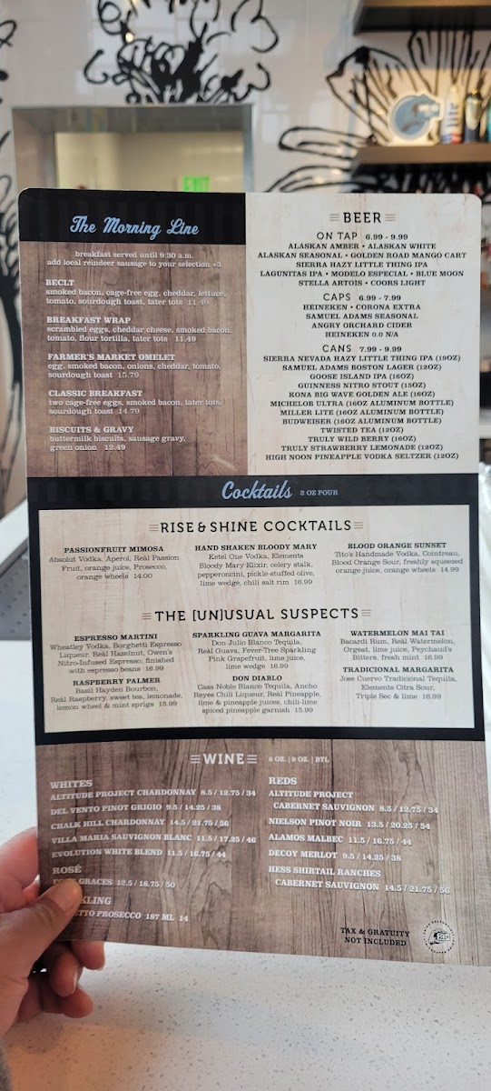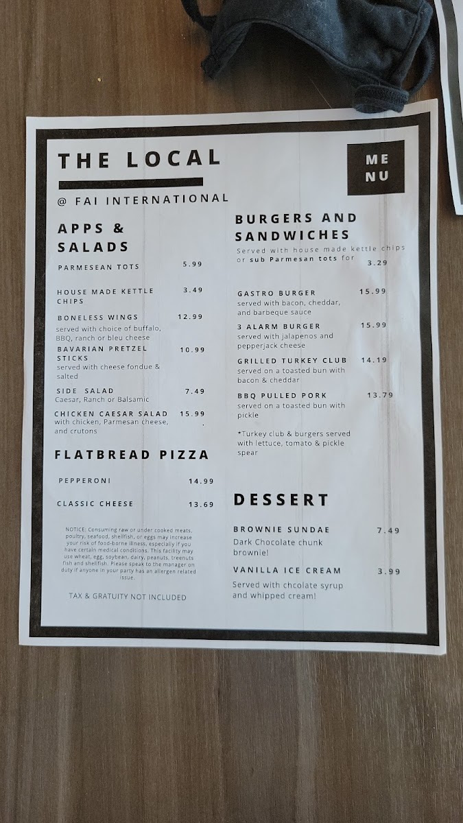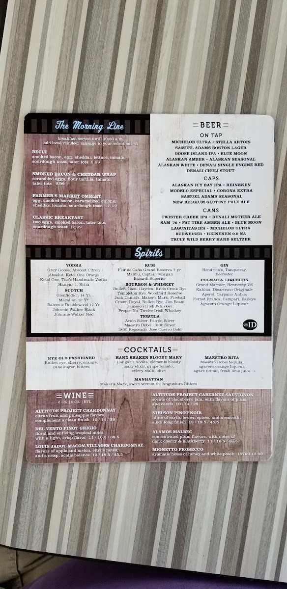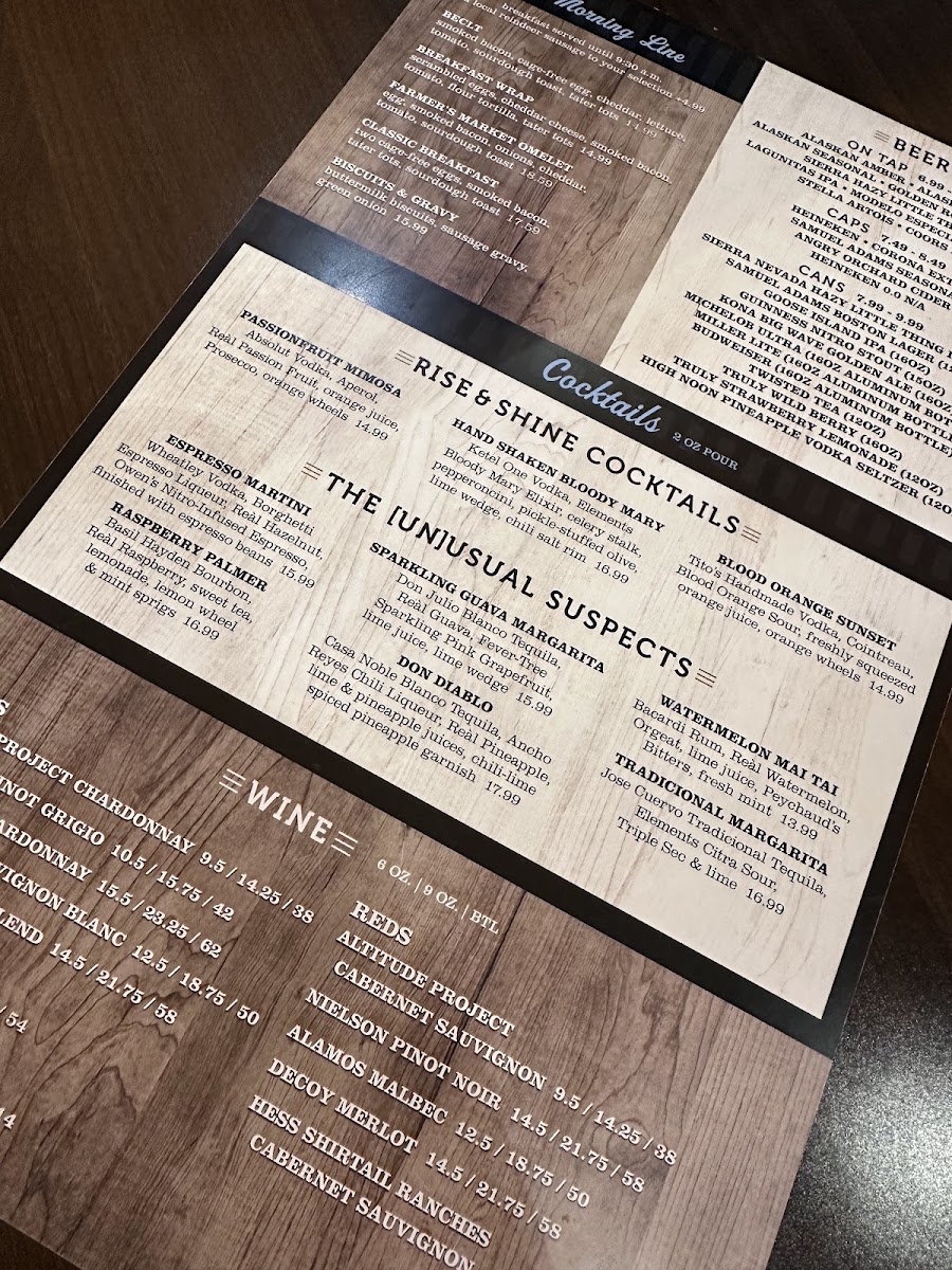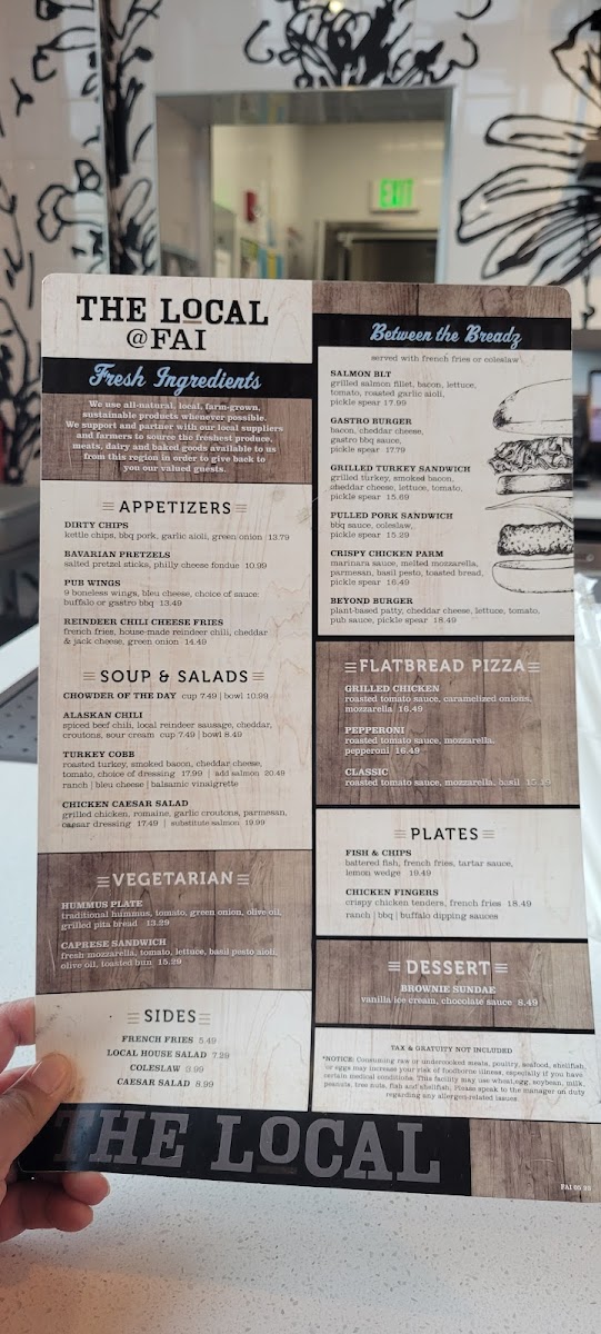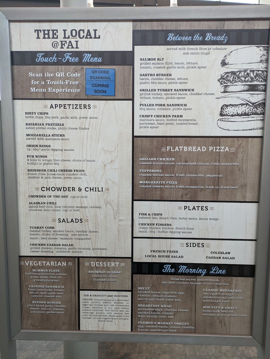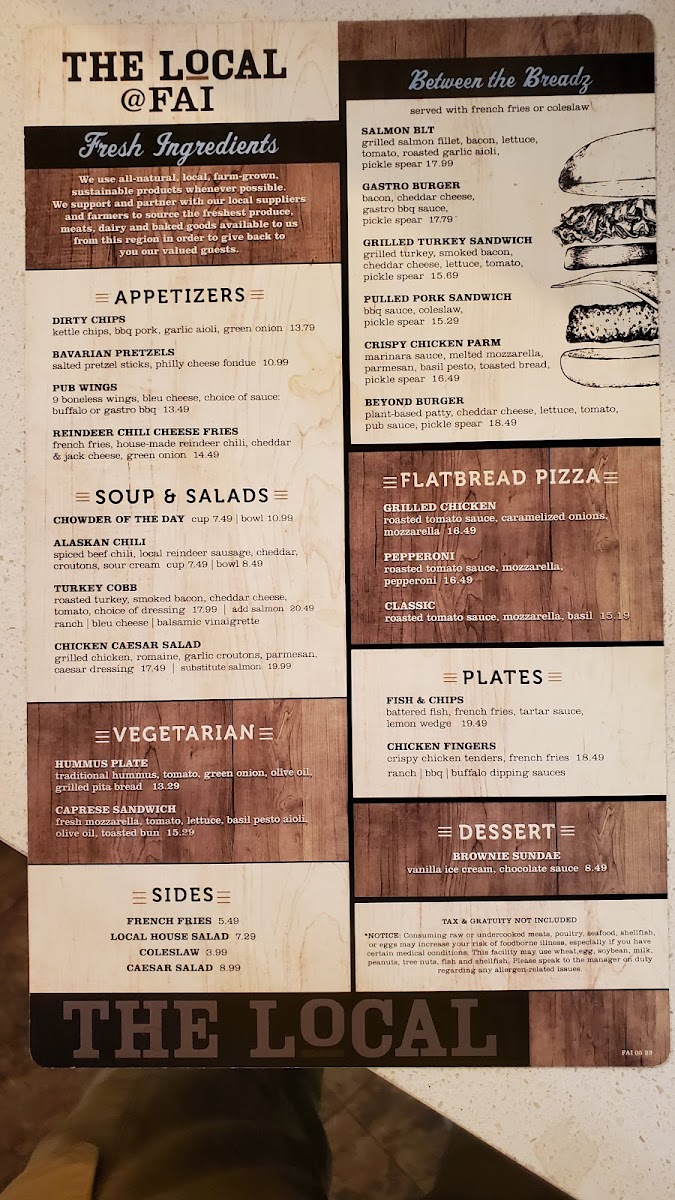 From a reviewer’s perspective, the menu at The Local in Fairbanks impresses with its mix of hearty pub fare, fresh salads, and indulgent comfort dishes. Starters like Dirty Chips, Bavarian Pretzels, Mozzarella Sticks, Onion Rings, and Pub Wings set a playful tone, while warming options such as Chowder of the Day and Alaskan Chili provide a satisfying first course. The salads, including Turkey Cobb and Chicken Caesar Salad, offer lighter options alongside the robust “Between the Breadz” sandwiches and burgers, such as the Salmon BLT, Gastro Burger, Grilled Turkey Sandwich, Pulled Pork Sandwich, and Crispy Chicken Parm. Flatbread pizzas like Grilled Chicken, Pepperoni, and Margherita Pizza bring a casual Italian flair, while the vegetarian selections-Hummus Plate, Caprese Sandwich, and Beyond Burger-ensure inclusive choices. Sweet endings come courtesy of the Brownie Sundae, paired with a diverse beverage lineup: canned beers including Sierra Nevada Hazy Little Thing I and Guinness Nitro Stout, a rotating selection of wines such as Altitude Project Cabernet Sauvignon and Nielson Pinot Noir, and inventive cocktails like the Espresso Martini and Sparkling Guava Margarita. Breakfast offerings under The Morning Line, such as Beclt, Smoked Bacon & Cheddar Wrap, and Farmer’s Market Omelet, complement heartier brunch-style dishes like Breakfast Burritos and Egg & Cheese Bagels, with Coffee Cake, Pumpkin Bread, and Belgium Waffle Bread rounding out the morning menu. With a comprehensive selection of appetizers, mains, vegetarian fare, desserts, and both casual and craft beverages, the menu demonstrates a thoughtful balance of flavors and comfort, making The Local a versatile spot for any time of day.